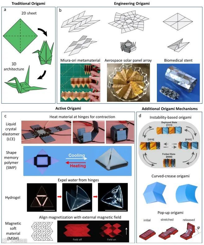 折纸能将2D板材转化为复杂的3D形状或将展开结构重塑为紧凑的折叠状态的能力,在不同的工程领域和研究领域引起了极大的关注和发展(如航空航天结构、超构材料、机器人等)。由于折纸的力学性能可以通过折纸图案的几何参数进行调节,因此可以设计具有超构材料等多种力学性能的结构。虽然折纸的可折叠性和形状可重构性提供了重要的结构可重构性,但驱动形状变化的传统方法在很大程度上依赖于手、马达或气动泵提供的机械载荷。在工程应用中使用手动加载往往是不切实际的,而电机和气动驱动系统往往体积庞大,需要复杂的控制,特别是对于高自由度驱动。另一方面,主动材料在响应外部刺激时可重新配置,无需外部机械载荷和笨重的驱动系统。近年来,主动材料,也称为刺激响应性材料或智能材料(如状记忆聚合物和合金、水凝胶、液晶弹性体等),为可重构系统的驱动提供了替代策略。这些材料及其含功能基团/填料的复合材料对外界刺激包括光、热、电场或磁场以及pH都有响应。利用主动材料,传统折纸被发展为主动折纸。这些由刺激响应材料驱动的折纸系统具有体积较小的优点,因为它们不需要电机或其他外部驱动器,重量轻、可编程、远程可控或无绳的,以及能够选择性或分布式驱动。这些优点可以使其在远程或生物空间的应用成为可能,而传统的驱动系统在这些地方是不可行的。