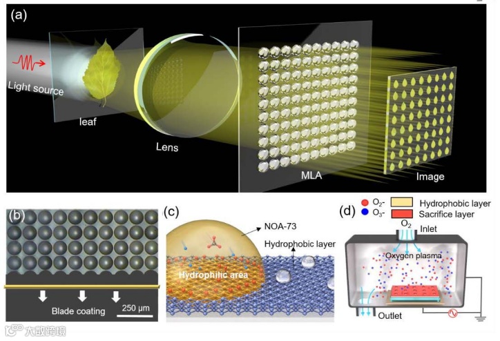 图一:采用MLA实现集成成像的示意图及采用氧等离子体进行选择性润湿表面原理。(a)MLA集成成像示意图。(b)基于刀片刮涂技术的MLA制造过程。(c)选择性润湿机制。(d)基于反应离子蚀刻的氧等离子体改性工艺。
