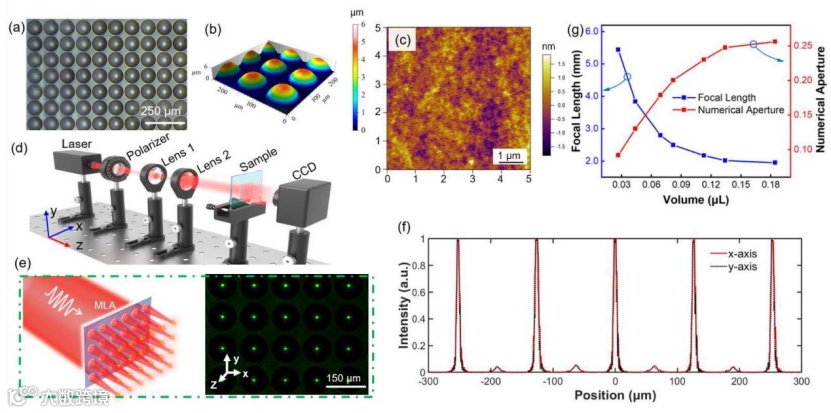 图二: 实验制造的MLA的光学特性表征。(a)孔径为100 μm的MLA形貌图。(b)MLA中单个微透镜的三维形貌。(c)原子力显微镜检测的MLA表面粗糙度。(d)MLA光学性能表征光路。(e)实验记录的焦平面上的焦斑。(f)焦平面上沿x、y方向的光强分布。(g)液体体积与MLA焦距、数值孔径NA的关系。