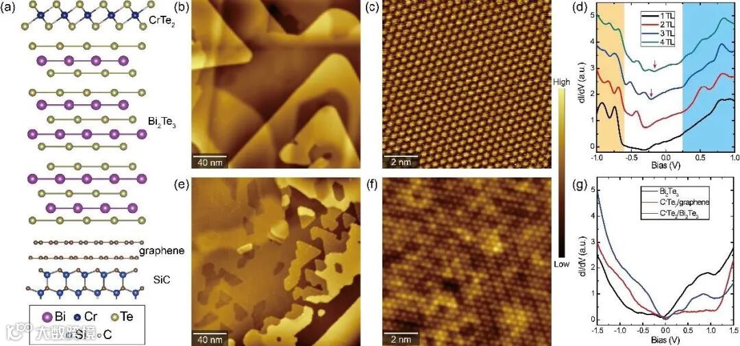 图1 (a) CrTe2-Bi2Te3异质结的原子结构模型侧面图;(b, c) Bi2Te3的STM大尺度形貌和原子分辨;(d) 不同厚度Bi2Te3的STS光谱;(e, f) Bi2Te3上的CrTe2的STM形貌和原子分辨;(g) CrTe2-Bi2Te3的异质结的STS谱