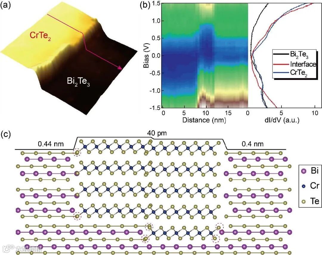 为了研究CrTe2-Bi2Te3异质结的界面物理,研究人员跨台阶做了一系列微分电导谱来表征其界面处的电子结构变化,从图3b中可以清晰看到界面处的电子态明显不同于CrTe2和Bi2Te3上的遂穿谱,且从CrTe2薄膜平滑过渡到Bi2Te3台阶上,而薄膜本身电子态也与其本征电子结构明显不同(图1g),这说明两种薄膜在界面处产生了较强的电子能带杂化,这意味着在该异质结中Bi2Te3中的拓扑表面态可以近邻到CrTe2薄膜上,与CrTe2中的磁性产生耦合,这将有可能增强DM相互作用,产生斯格明子等现象。为了进一步揭示界面处的原子结构,本文实验团队结合之前工作的经验和结果,搭建了如图3c所示的界面原子结构模型,通过设计共用Te原子层的思路成功用该模型解释了在该异质结中观测到的实验现象。
