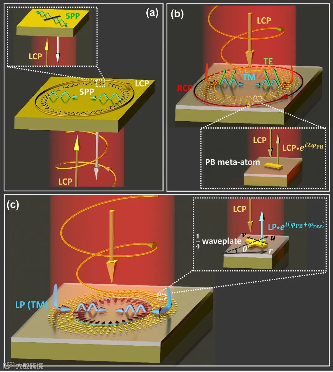 最近,基于超构表面的概念,研究者在太赫兹波段实验证明了各种等离激元的超构器件。这些超构器件是由对CP光具有特定反射相位的PB超构原子组成。将PB的相位调制机理与共振型的相结合,并对整个器件的相位轮廓进行编码,该超构器件就可以将传输波转换为表面波并同时实现对SPP波前的调控。与金属纳米孔的SPP透镜相比,这种超构器件通过特意的设计具有了更高的工作效率(见图1(b),此处,局域元胞被设计为一系列具有高偏振转换效率(PCR)的半波片)。然而不幸的是,到目前为止,基于该方案的SPP透镜尚未在光学频率下实现。此外,利用这种方案设计的SPP超透镜所产生的局域光场是圆偏振的,这与本征SPP所支持的TM偏振间是失配的。这种偏振的失配会使得SPP在传播过程中产生反射,这不可避免的就降低了该SPP透镜的耦合效率。