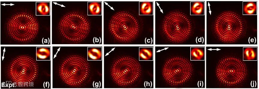 在以上验证实验的基础上,该团队分别制备了两个SPP透镜,一个是弧形的,另一个是圆形的,并实验验证了这两个透镜的性能。第一个透镜可以高效地将SPP 聚焦到单个点上,结果见图3。第二个透镜则是将光场局域到结构中心,形成了一个超越光学衍射极限的光波热点,并表现出明显的OAM特性,结果见图4(c)和(d)。同时,与之前的方案相比,该SPP耦合器的工作效率得到了显著的提高,其在结构中心处产生的聚焦热点的强度是基于纳米小孔和PB 超构表面等离激元透镜的50倍和5倍之多(见图4(f)所示)。此外,对环形透镜所激发SPP场的偏振测试结果也很好地证明了该透镜的径向矢量偏振特性(见图5)。
