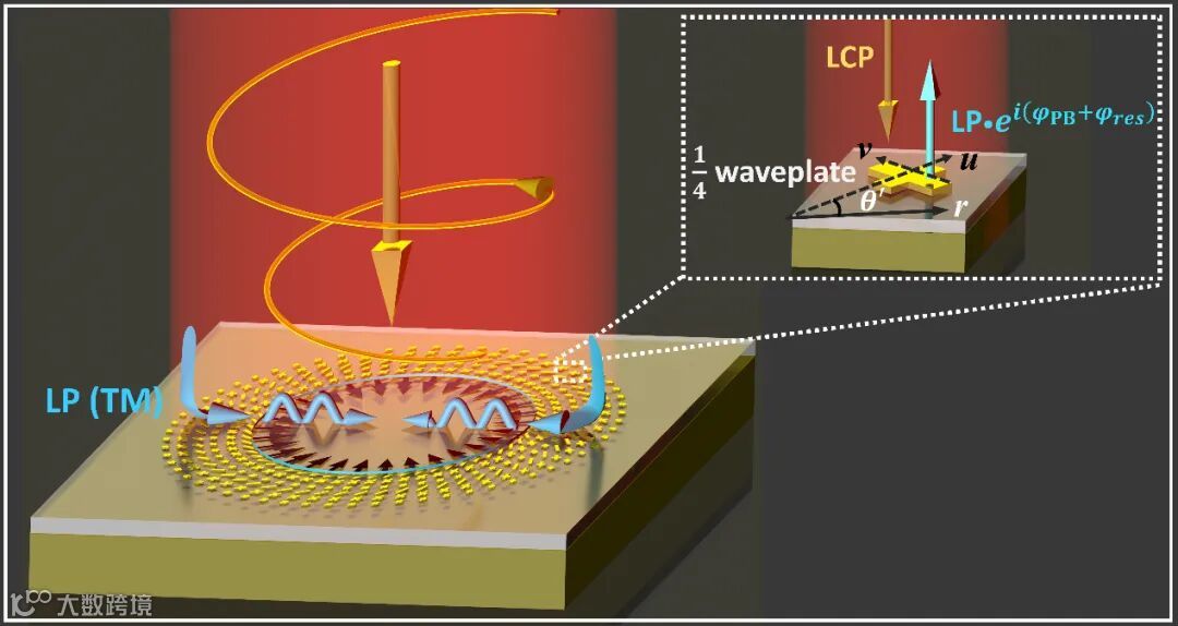 图2 该团队所设计的等离激元透镜的工作原理及亮点:该透镜同时解决了PW-SPP的波矢失配问题,以及局域元胞耦合器所产生的SPP与本征SPP间的偏振失配问题,因此能够高效的将PW转变为预先设计好的聚焦涡旋SPP。
