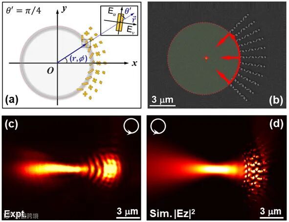 图3 弧形等离激元透镜的性能表征结果。(a)和(b):弧形等离激元透镜的设计方案示意图及对应的SEM照片;(c)和(d):弧形等离激元透镜在LCP偏振光作用下所激发SPP近场强度分布的实验测试及数值模拟结果。