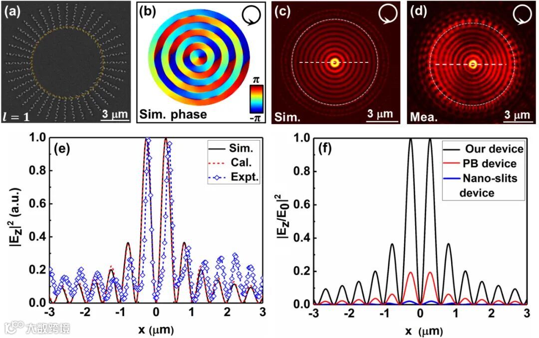 图4环形等离激元涡旋透镜的性能表征结果。(a)环形等离激元涡旋透镜的SEM照片;(b)和(c):SPP透镜在LCP偏振光的作用下所激发SPP的位相及电场强度分布的数值模拟结果;(d) SPP透镜在LCP偏振光的作用下所激发SPP 强度分布的实验测试结果;(e) SPP透镜所激发近场的一维强度分布的对比结果(黑色实线:数值模拟结果; 蓝色点划线:实验测试结果;红色虚线:理论计算结果);(f) 该环形SPP透镜与之前提出的基于纳米孔和PB超表面等离激元透镜所激发SPP强度分布的对比结果。