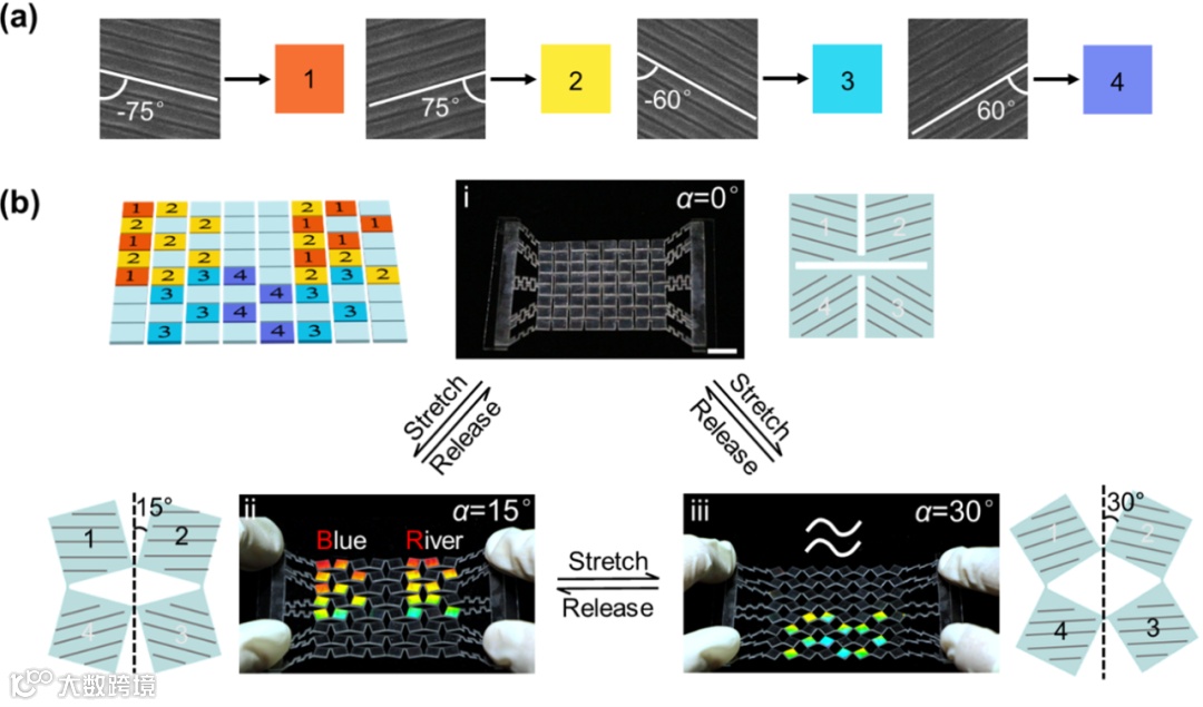 图2 通过光栅初始方位角的设计编程实现多通道信息加密。(a)设计了四种具有不同初始方位角的剪纸光栅单元作为编码单元;(b)通过拉伸读取加密图案的过程。在初始状态,图案是完全隐藏的(i),随着拉伸应变的增加,“BR”字母(ii)及河流(iii) 图案依次显现。