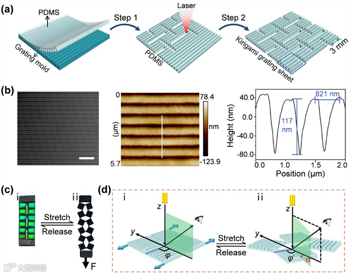 图1 剪纸光栅超材料的设计流程。(a)剪纸光栅超材料的制备过程;(b)光栅结构表征;(c)剪纸光栅超材料在拉伸应变下显示出可逆的颜色变化;(d)剪纸光栅超材料颜色变化原理示意图。