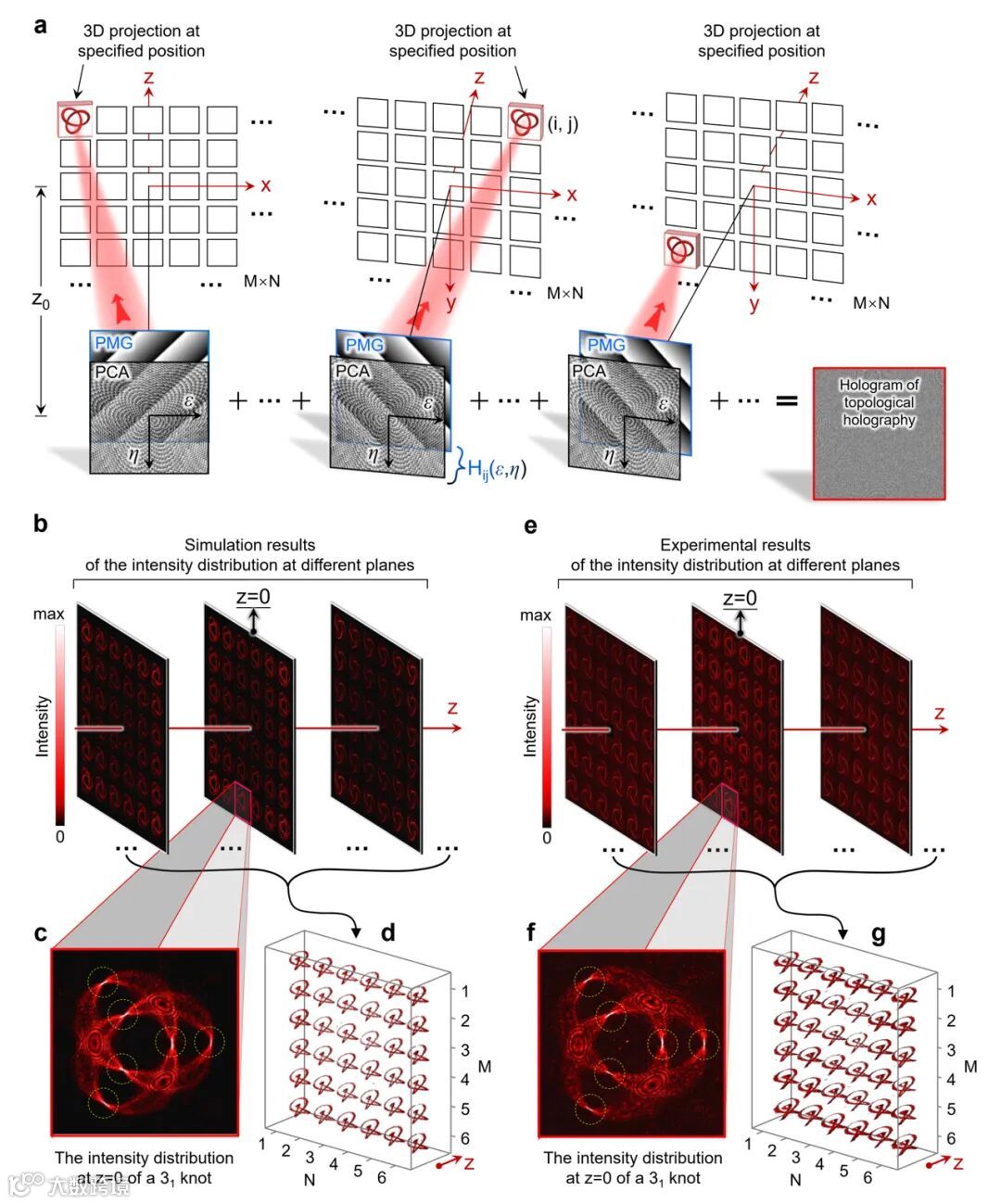 2019年,Ren等人,将轨道角动量自由度引入到全息技术中,通过生成空间阵列分布的轨道角动量态和基于轨道角动量态的强选择方法,实现了轨道角动量全息[Nat. Commun. 10, 2986 (2019); Nat. Photon. 14, 102 (2020)]。类似的,在本研究中,研究人员将拓扑纽结结构作为一种全新的三维自由度引入到全息技术中,通过生成三维空间阵列分布的拓扑纽结结构,实现了光拓扑全息,方案示意图如图1所示。首先设计能够生成三维光学拓扑纽结结构的全息图(PCA);然后设计不同的平移光栅(PMG),使得同一个三维纽结结构可以投影在不同的空间位置;最后,由所有的PCA和PMG集成而得到的一个全息图(Hologram of topological holography)即可用于生成一个三维纽结结构阵列。进而实现光学拓扑全息。图1(b, c, d)为理论结果,图1(e, f, g)为实验结果。