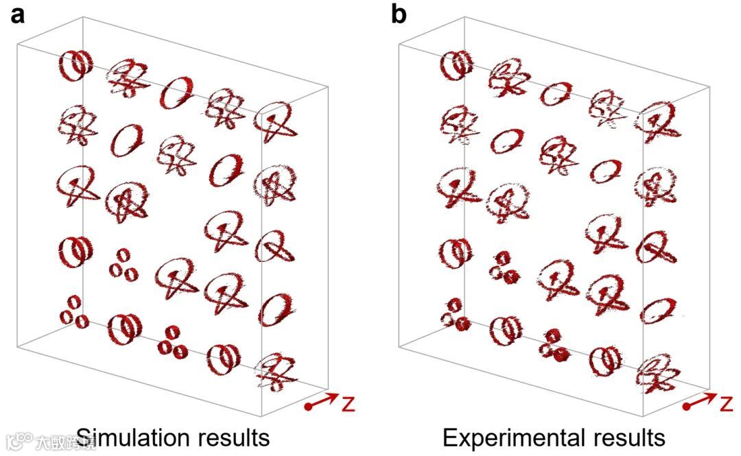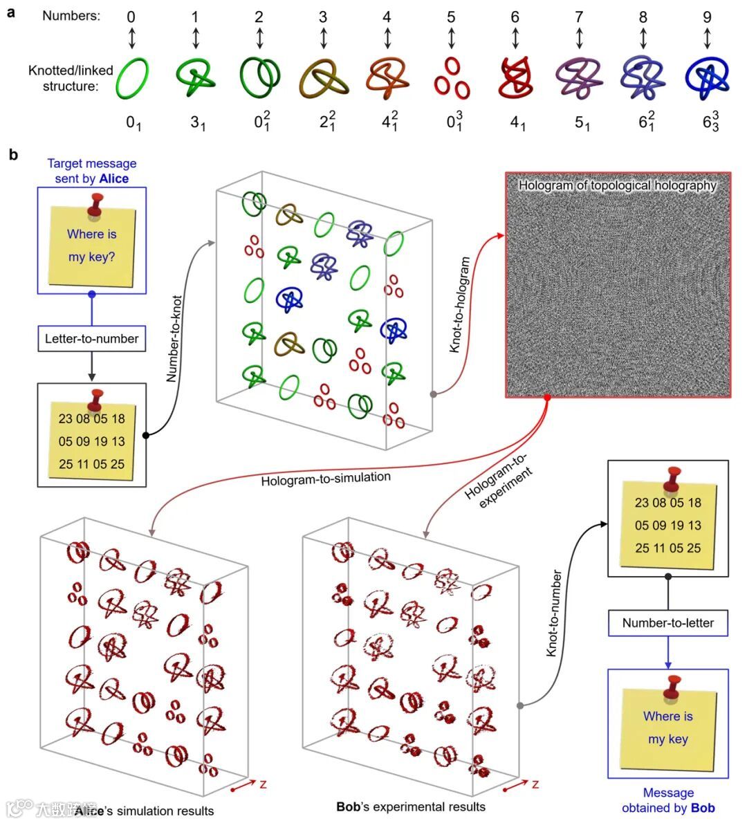 为了证明拓扑全息编码方案的可行性,研究人员选择了十种纽结结构来编码0到9这十个数字,如图3a所示。然后,使用从01到26等两位数字分别表示从A到Z的字母。为了更加具体地描述编码方案,图3b展示了一个实例。这里,目标信息是 “Where is my key”,先将字母信息转换为数字组合“23 08 05 18 05 09 19 13 25 11 05 25”,再根据图3a将数字组合转换为纽结结构的组合。基于图1a所示过程,Alice(信息发送者)构建拓扑全息图,用于制备相应的纽结结构阵列。然后,Alice将全息图发送给信息的接收者Bob。Bob通过拓扑全息重构出实验结果,获得每个拓扑结构的拓扑不变量,识别拓扑纽结结构的类型,并将其转换为字母;最后,Bob获得Alice想要发送的消息“Where is my key”。