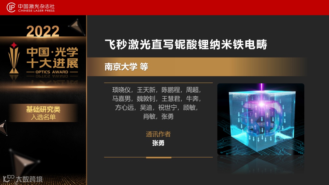 南京大学张勇领衔的研究团队发展了一种非互易激光极化铁电畴技术:将飞秒脉冲激光聚焦于铌酸锂晶体中,在晶体内部形成了一个有效电场,实现了三维纳米铁电畴的可控制备。加工精度达到了30纳米,远远突破衍射极限,且可以实现铁电畴结构的修正与重构。这一技术解决了传统极化工艺仅限于在二维平面内以微米精度加工铁电畴结构的难题,为三维集成光电器件的发展提供了新的技术支撑。