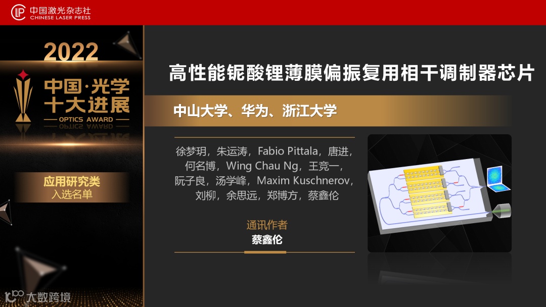 中山大学蔡鑫伦课题组实现了世界首例铌酸锂薄膜偏振复用相干光调制器,该器件具有CMOS兼容驱动的半波电压,110 GHz的调制带宽,这是目前世界上最高性能的超低电压和超大带宽的电光调制器芯片。利用这一芯片,研究团队演示了目前单载波相干传输的最高净速率——1.96 Tb/s。该项研究攻克了在下一代超高速、低功耗的相干光传输系统不可或缺的电光转换器件。铌酸锂薄膜材料及其光子集成技术研究为实现我国光通信产业链自主可控提供了有力保障。