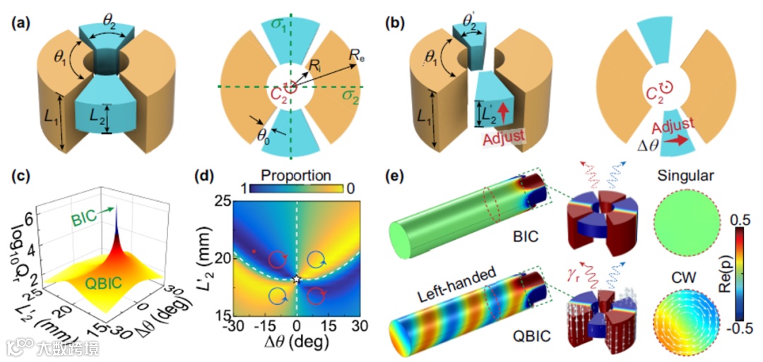 图2 (a)镜面对称的超构表面,(b)镜面对称破缺的超构表面,(c)参数空间中超构表面本征态的品质因子,(d)参数空间中超构表面本征态的模式成分,(e)BIC和手性QBIC的本征场图。