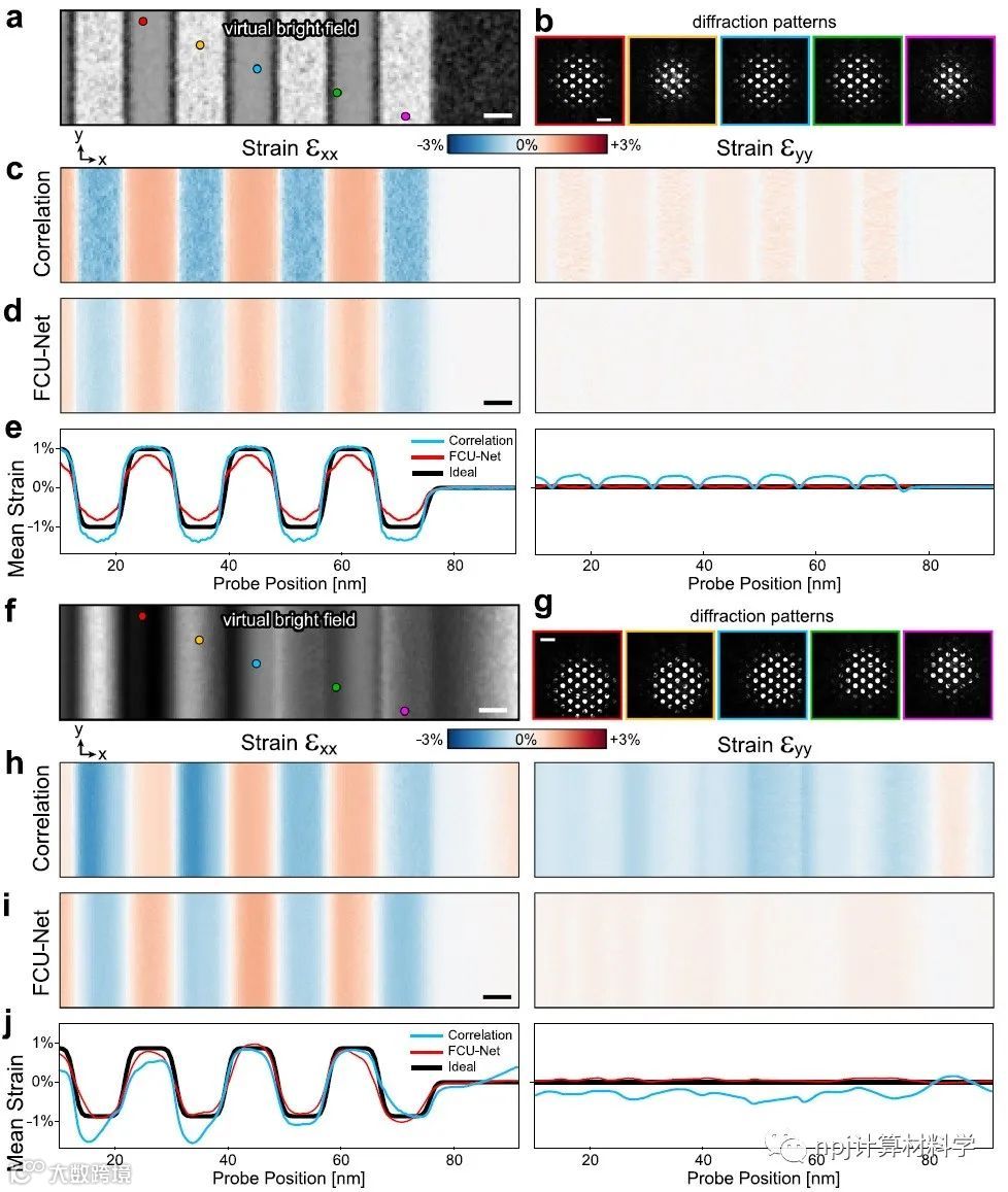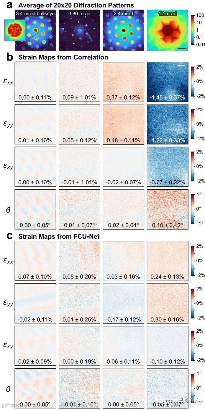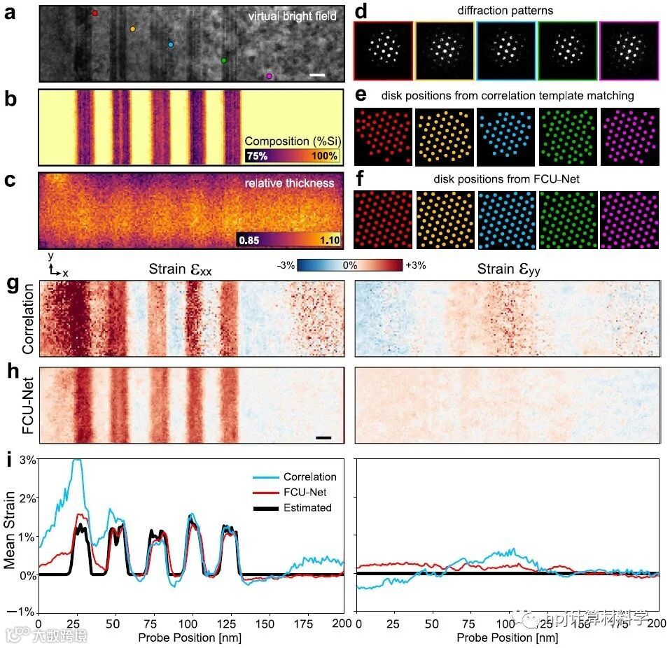 人工智能和机器学习算法越来越多地应用于材料表征中。其中,深度学习方法已被证明在涉及显微镜的各种计算机视觉问题(包括分类和分割问题)中优于经典算法。利用监督机器学习测量晶体和半晶体样品的布拉格盘位置和底层应变场,被认为是衍射盘强度到底层结构因子的像素级映射。