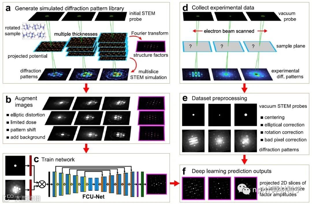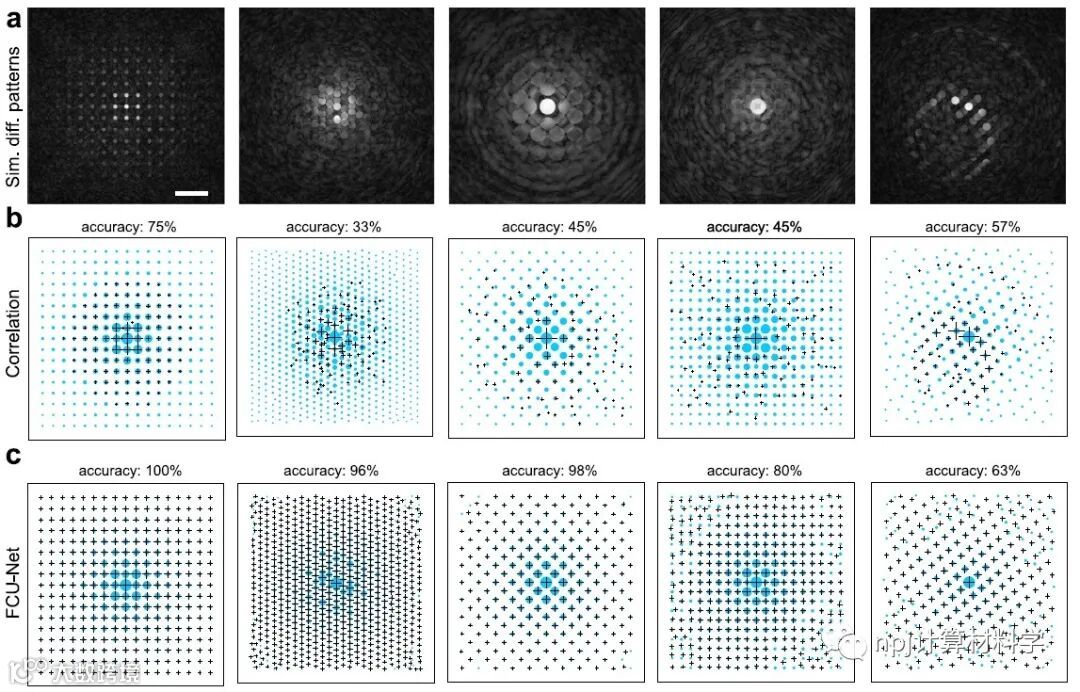 来自美国阿贡国家实验室纳米材料中心的Joydeep Munshi等,开发了一个深度学习网络(FCU-Net),可以学习从测量的衍射模式强度到材料的潜在结构因子的映射。作者训练了20多万个独特的模拟衍射图案数据集,其厚度从2 nm到50 nm不等,跨越1000多个不同的晶体体系,包括许多方向和显微镜参数。以模拟数据的基本结构因子为基准,他们比较了FCU-Net与传统模板匹配方法的准确性。他们发现,FCU-Net的布拉格圆盘位置测量结果比传统的模板匹配方法更加准确。