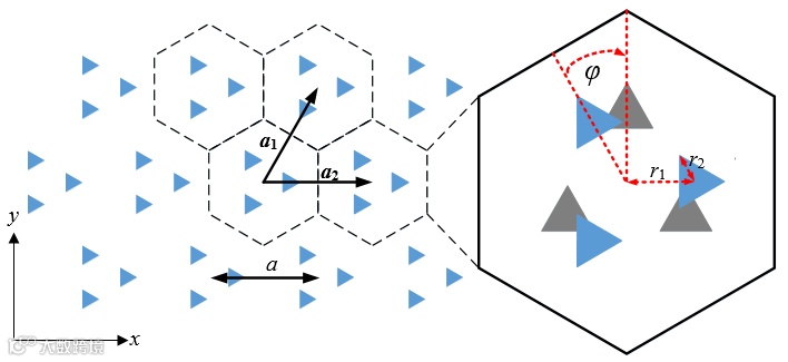 图1.结构模型示意图。三角复式晶格单胞内由三个三角形旋磁介质柱组成。三角介质柱绕中心旋转会导致谷拓扑相位的变化。