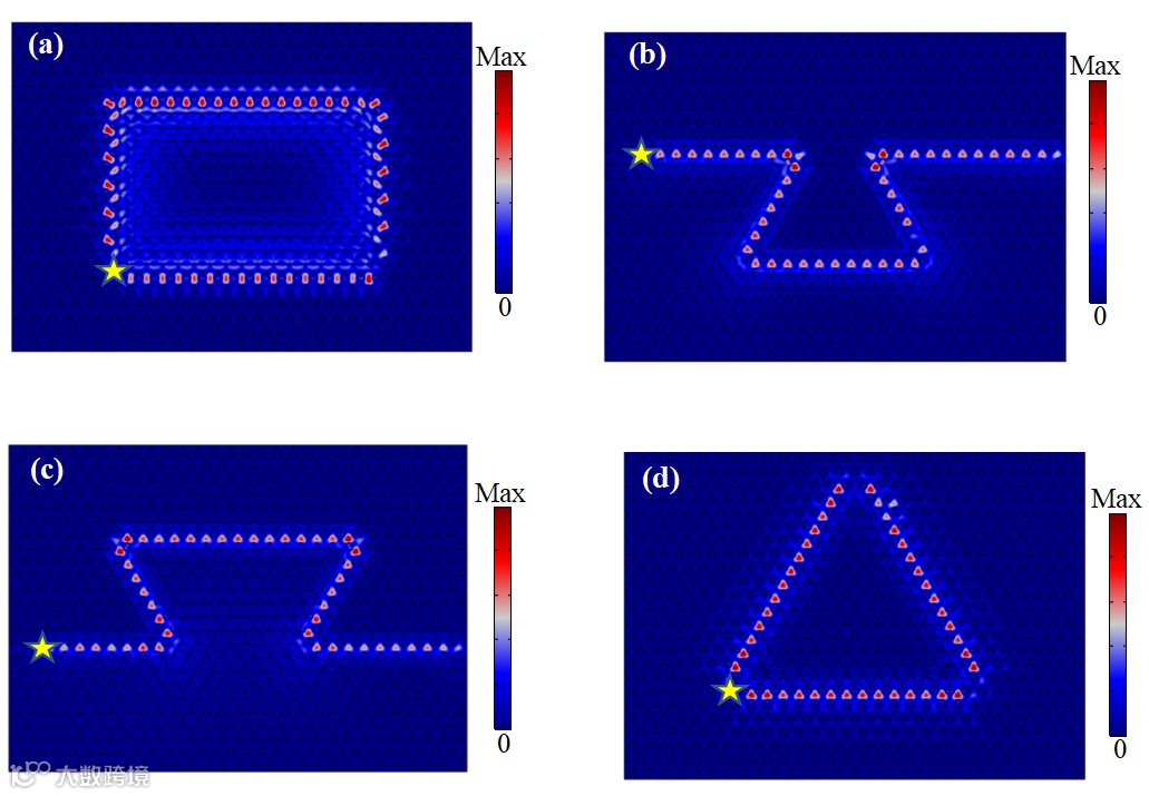 图6. 在图5基础上由磁场设置多样的边界,拓扑边界态传输的仿真结果。