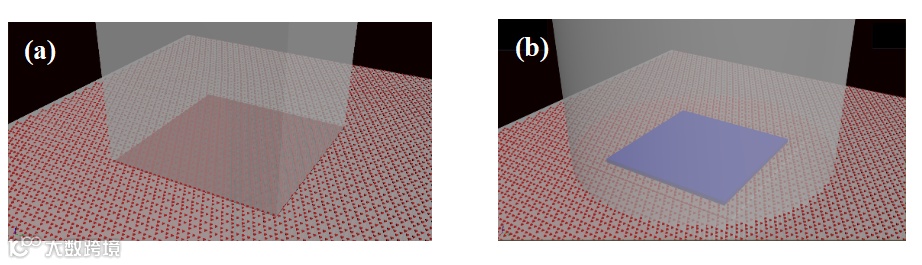 图5. 磁场调制下形成的边界示意图。左图边界完全由磁场边缘界定,右图蓝色面积是磁屏蔽模板,边界由模板设定。