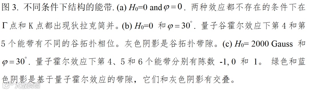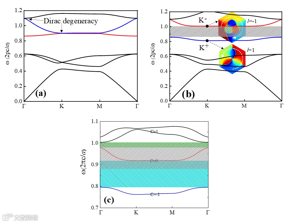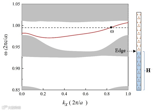 图4. 模型超胞和边界态。右边插图超胞有相同的旋磁介质柱组成,下半部分加磁场,上半部分不加磁场。加磁场的部分产生量子霍尔效应,不加磁场的部分产生量子谷霍尔效应。左边红色曲线是两种效应下形成的拓扑边界态曲线,灰色部分是体带。