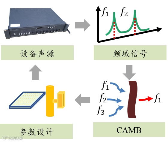 工业设备在正常使用过程中,其噪声频率成分并不均匀,由于设备内部各零件在运行过程中具有不同的特征频率,其频谱特性往往由离散的低频成分和连续的高频成分组成。因此,为了在工业条件下实现轻量化,超材料设计不再完全追求宽带的隔声性能,而是实现可自由设计的选择性隔声性能,针对不同的设备所产生的特定噪声频谱,定制不同的结构进行智能隔声。