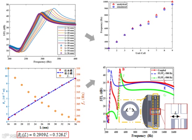 在低频参数设计过程中,亥姆霍兹谐振腔由原来的柱状结构变为扇形结构,因此需要分析喉管部分的变截面参数对于亥姆霍兹谐振腔谐振时的效果。可以得到拟合有效半径和实际喉管长度的关系。通过该关系,反向设计超材料的低频部分。得到如图3中的效果,不论是单个腔体设计还是耦合设计,都能够在目标频率内实现低频隔声的效果。