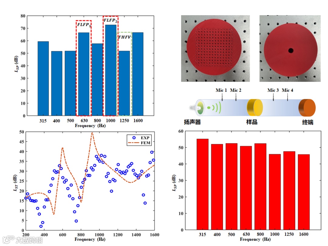 利用前述参数库,我们设计了如图5所示的CAMB。在声阻抗管测试系统中,对加工的样品进行测量,得到如图所示的结果。显然,在不同局域谐振单元的作用下CAMB同时实现了对低频和高频的噪声选择性隔声。