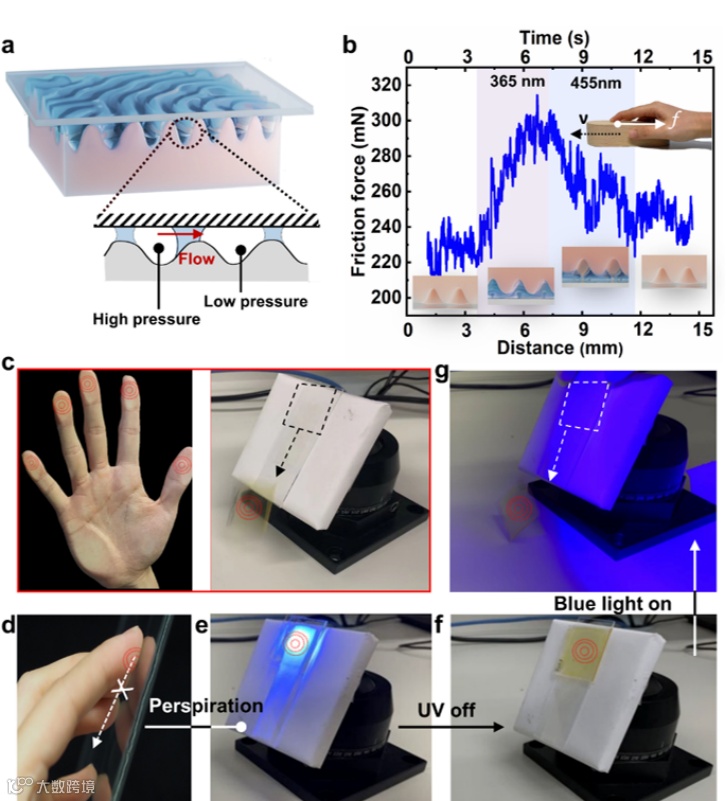 图3. 指纹状人造仿生涂层的摩擦学特性。 a) 涂层表面指纹形貌和玻璃平面之间毛细管桥接的示意图。b) 365 nm或455 nm光刺激下涂层在水平玻璃板上滑动摩擦力变化。指纹状人造仿生涂层附着在 60⁰ 载玻片上的试验,以模拟人手的摩擦:c) 表面干燥的涂层及其基板从载玻片上滑落以及相应的假设场景。 d) 在紫外线照射下,出汗的涂层附着在载玻片上; e) 停止紫外线照射后,涂层仍附着在载玻片上;f) 蓝光照射触发液体被吸收,涂层及其基板从载玻片上滑落。