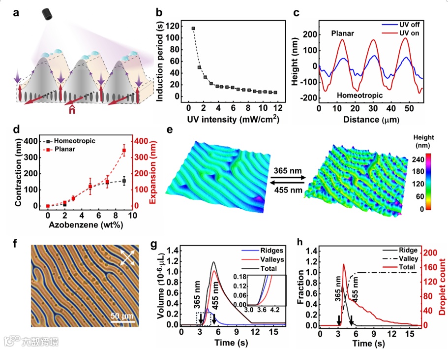 图2. 指纹状人造仿生涂层的指纹脊在光的控制下分泌或吸收液体。a) 指纹脊在紫外线照射下分泌液体示意图。b) 由紫外线照射引发的液体分泌的诱导期长度随光强度变化。c) 紫外线照射前后涂层的二维轮廓变化。d) 在诱导期,垂直取向区域的收缩和平行取向区域的扩张随偶氮苯浓度的变化。e) 数字全息显微镜 (DHM) 测量显示该人造仿生涂层排汗和吸汗过程。f) 液体分泌后涂层的偏光显微镜图像。图像分析显示 g) 分泌液体的体积和 h) 涂层指纹脊/谷中液滴随时间推移的变化。