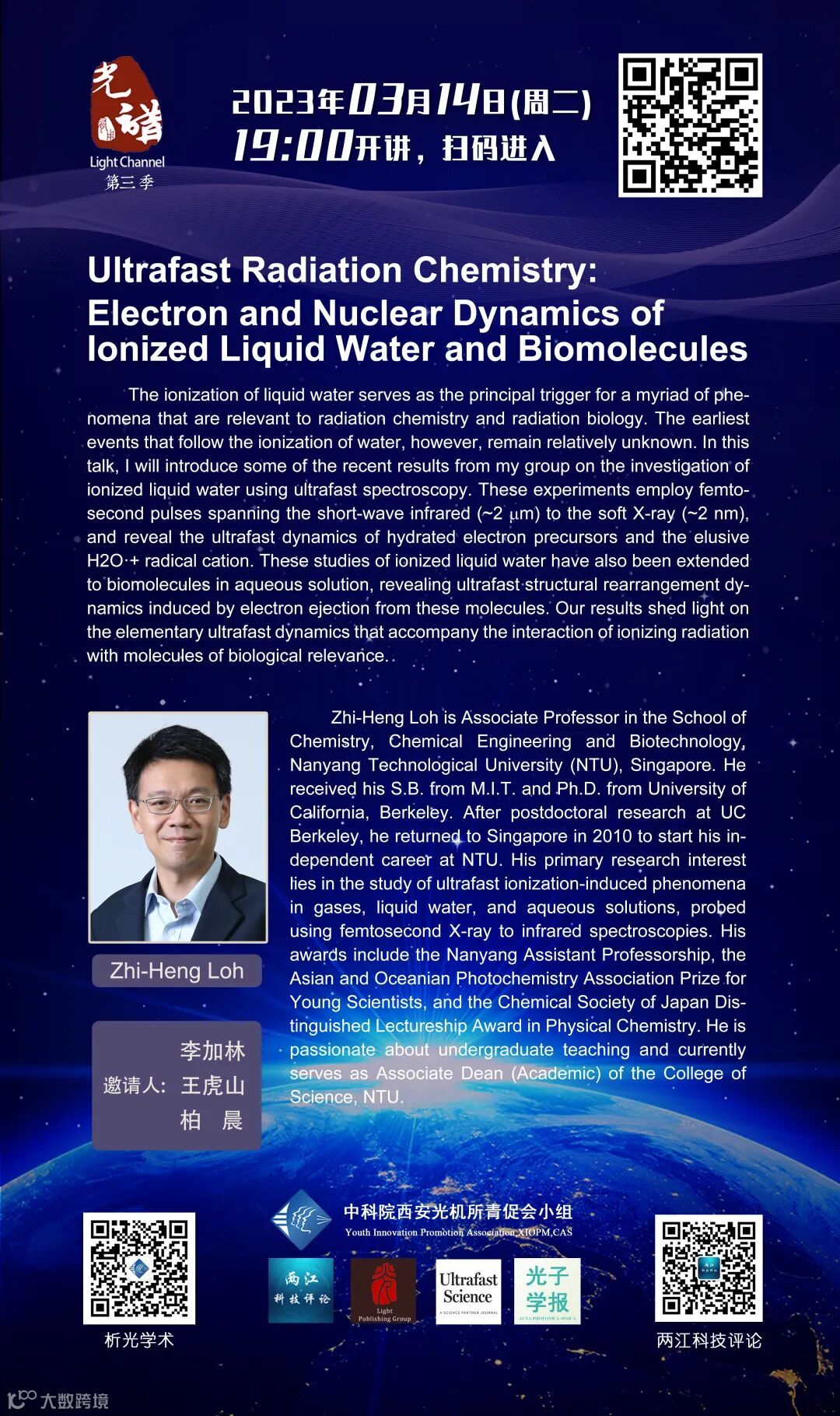 Zhi-Heng Loh is Associate Professor in the School of Chemistry, Chemical Engineering and Biotechnology, Nanyang Technological University (NTU), Singapore. He received his S.B. from M.I.T. and Ph.D. from University of California, Berkeley. After postdoctoral research at UC Berkeley, he returned to Singapore in 2010 to start his independent career at NTU. His primary research interest lies in the study of ultrafast ionization-induced phenomena in gases, liquid water, and aqueous solutions, probed using femtosecond X-ray to infrared spectroscopies. His awards include the Nanyang Assistant Professorship, the Asian and Oceanian Photochemistry Association Prize for Young Scientists, and the Chemical Society of Japan Distinguished Lectureship Award in Physical Chemistry. He is passionate about undergraduate teaching and currently serves as Associate Dean (Academic) of the College of Science, NTU.