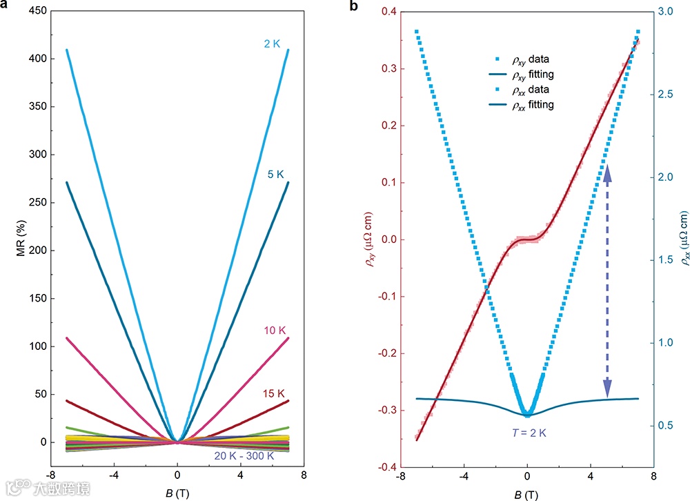 图2. a, 各温度下的磁电阻曲线,20 K以下观测到大的线性正磁电阻;b, 2 K的磁电阻和霍尔电阻率曲线以及双载模型拟合曲线,磁电阻数值远高于双载模型数值。