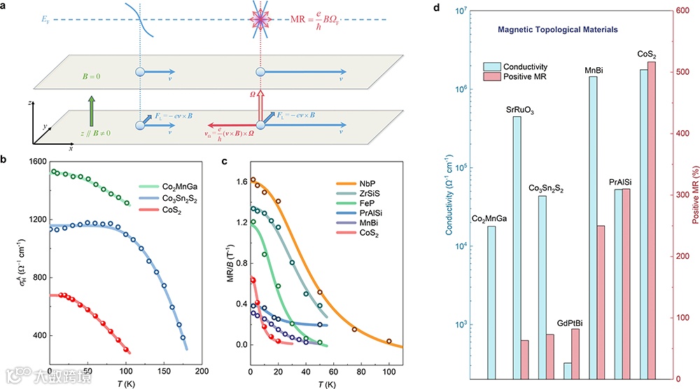 图3. a, 贝利曲率主导线性正磁电阻物理图像;b, 反常霍尔电导率随温度变化及模型拟合;c, 线性正磁电阻随温度变化及模型拟合;d, 磁性拓扑材料中电导率与正磁电阻对比。