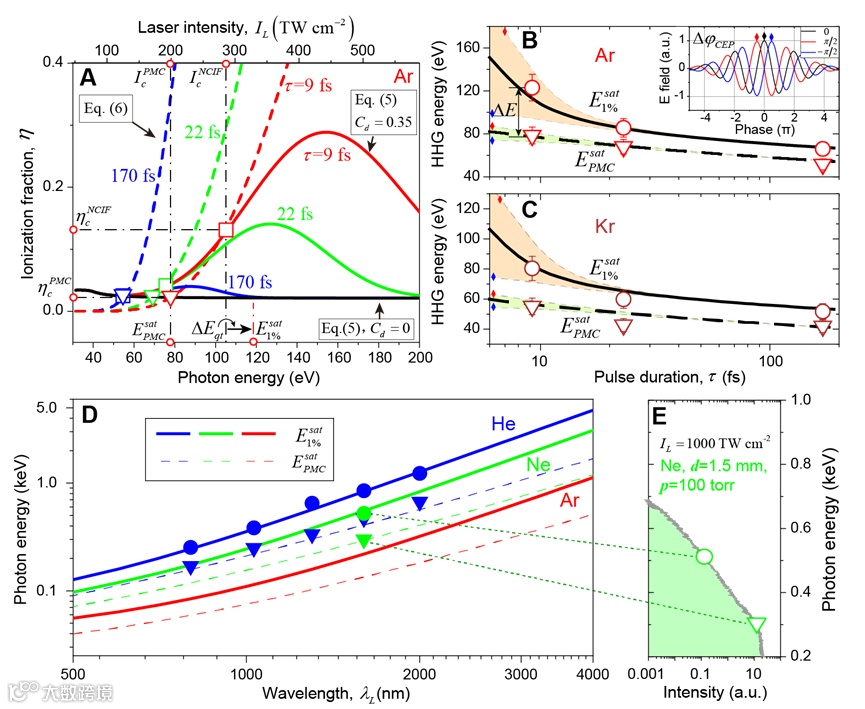 更进一步的,研究团队提出了一个理论模型,可以用于准确预测对于不同脉冲长度、激发光强度以及气体条件下所能达到的最高相位匹配光子能量,如图3。模型同时也揭示了在应用少周期中红外强激光驱动产生谐波时,非绝热相位匹配的作用会越来越重要。这些发现对于开发高亮度软X射线光源,并在光谱学和成像研究方面应用都非常重要。