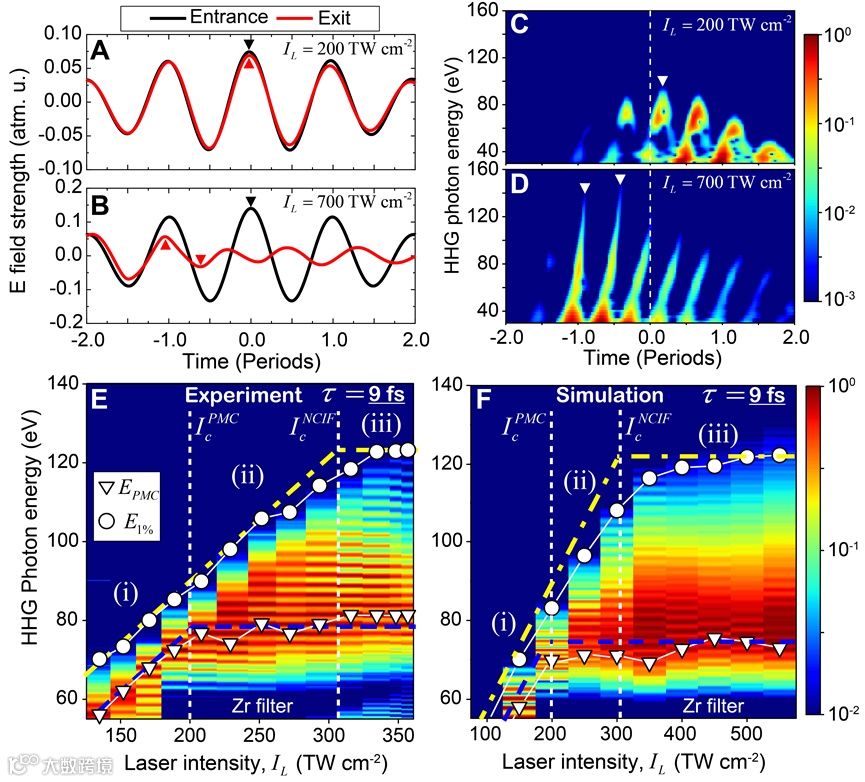 本研究中,研究团队通过模拟发现高强度、少周期驱动光在经过气体过程中,由于强电离所产生的等离子体作用而发生剧烈的脉冲形变、强度衰减等非绝热效应。而形变的脉冲会进一步改变电子轨迹,从而影响驱动光与谐波光之间的相位匹配,如图1所示。实验上,我们首先研究了非绝热效应对于谐波光谱的影响。我们揭示了谐波光谱和驱动光强度之间的关系存在三个不同的区间:第一个是光谱的相位匹配截止能量和单原子响应下的截至能量吻合,随着驱动光强度线性增强;第二个是光谱的相位匹配截止能量达到饱和,但光谱强度百分之一所对应的能量和驱动光强度仍然呈现线性增加趋势;第三个是光谱的相位匹配截止能量和强度百分之一所对应的能量都达到饱和,如图2所示。