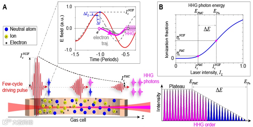 本工作通过系统性地对气体高次谐波产生过程在不同驱动条件下的实验和理论研究,建立了一个考虑非绝热相位匹配的临界电离率模型。该模型可以精确预测谐波光谱随驱动光强度的变化和扩展,这在少周期中红外激光驱动气体高次谐波过程中尤为重要。