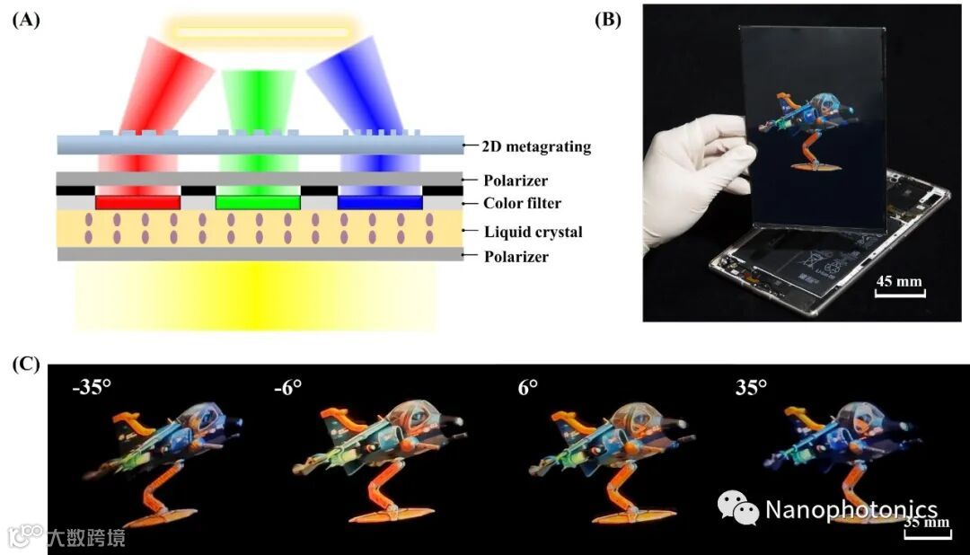 进一步地,将制备的超构光栅阵列与LCD显示屏逐像素对准,搭建了8.4英寸的彩色动态光场3D显示样机(图4)。在显示器总信息量为2560×1600的情况下,将高需求视角的空间分辨率提升为119.6 ppi(pixel per inch),角分辨率提升至0.25 vpd(views per degree)。此外,水平视场角达到140°。