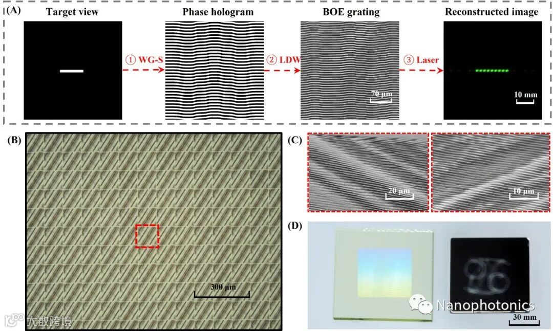针对上述挑战,研究人员进一步提出空间分辨率与角分辨率同时调控,实现信息与能量按需排布的光场3D显示新方法。基于“信息按需排布”这一思想,研究者将不同视差图按照观看习惯投影到不同的视角区域(见图1(A))。将像素数目按需排布,促使3D显示空间分辨率呈现类高斯函数分布(图1(B)),从而提升了高需求视角的空间分辨率(图1(C))。此外,研究人员基于相位恢复原理,设计了超构光栅阵列来调控各视角的光场分布,从而调整角分辨率分布。利用自主设计的变标度傅里叶变换干涉光刻系统实验制备了大幅面超构光栅阵列(图2)。