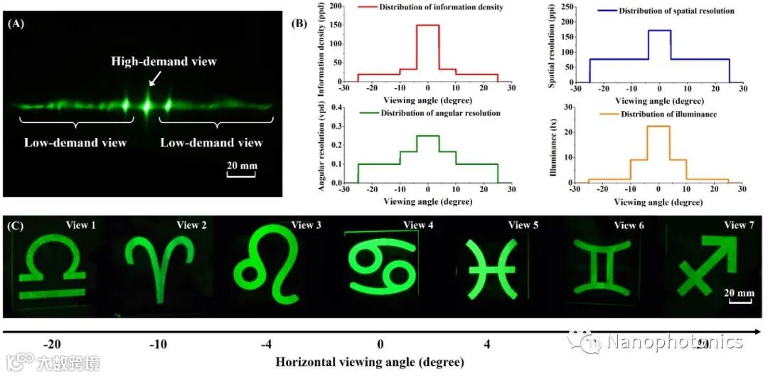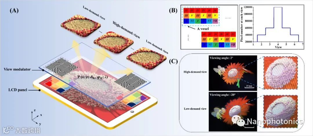 “各尽所能,各取所需”——“按需分配”是一种被广泛运用的社会分配方式,通过合理分配有限资源来应对日益增长的需求。受此启发,近日,苏州大学陈林森研究员和乔文教授团队在Nanophotonics发表最新文章,提出了分辨率渐变调制方法,实现信息与能量按需排布的光场3D显示(见图1)。团队利用大幅面超构光栅阵列,精确调控每个像素的投射,根据观看习惯分配显示器的信息量。此外,基于相位恢复原理调控各视角的光场分布。通过联合调控像素密度和视角排布,大大提升了高需求视角(high-demand view)的空间分辨率、角分辨率以及光照度。该研究成果不仅为高分辨率裸眼3D显示提供了新的设计思路,同时也证明了平面衍射光子器件应用于新型显示领域的可控性和优越性。