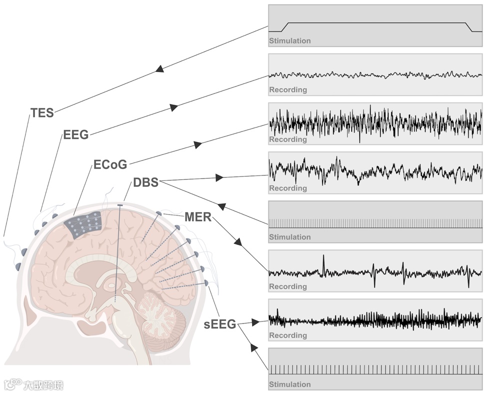 由于神经系统主要通过电信号传递信息,因此以电信号为媒介的脑机接口吸引了该领域最多的研究兴趣。下图展示了从皮层到大脑深部的主要记录和刺激方法。