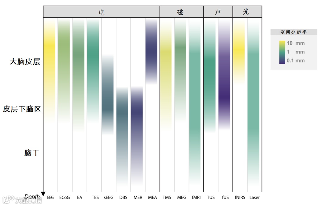 感知和调控人脑的常用方法(深度分布和空间分辨率)