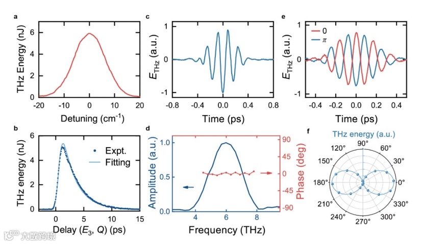 图3. R-FWM在金刚石中产生太赫兹的特性。a、 THz输出能量与共振失谐。b、THz输出能量相对于振动激励的时间依赖性。c、 通过GaP中的EOS测量的具有5 THz的太赫兹脉冲的时间曲线。d、对应(c)中THz脉冲傅里叶变换的振幅和相位谱。e、 CEP为0的THz脉冲(红色曲线)和为Π时的结果(蓝色曲线)。f、 测量(散射)和拟合(实心曲线)17 THz输出的极化分布,表明THz脉冲是线性极化的。