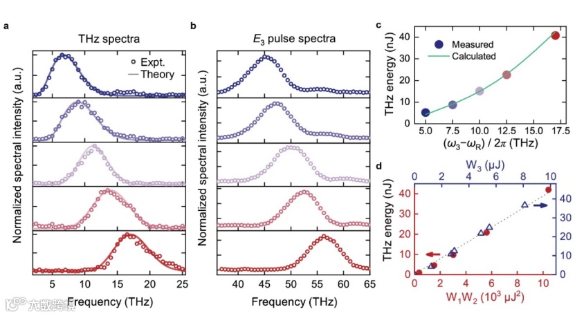 图2. 金刚石中通过R-FWM激发太赫兹脉冲的实验结果。a、 THz输出光谱。实线是理论拟合。b、 相对于(a)中的THz光谱测量的转换脉冲的一对一对应光谱。c、 (a)中设置的五个光束几何结构的每个脉冲(圆)的输出THz能量。d、显示太赫兹脉冲能量与能量乘积的线性关系。