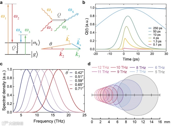 图1. 通过R-FWM在金刚石中产生THz的原理图。a、 描述具有拉曼共振的四波混频的能级图、费曼图和波矢量图。b、 不同脉宽的脉冲相干激发金刚石中1332 cm-1振动波的时间变化曲线。c、 选定条件下计算的太赫兹输出光谱. d、THz输出光束中不同频率分量的空间分布,对应(c)中θ=0.42°的情况。