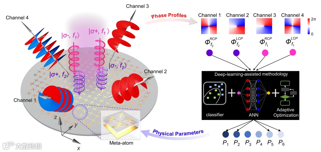图1 深度学习辅助的双频率/自旋复用超表面逆向设计示意图。