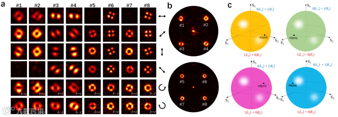 图3 大容量涡旋波束生成器件。八通道高阶庞加莱球光束的 (a) 不同极化分量,(b) 远场仿真分析结果,以及 (c) 它们在高阶庞加莱球上对应的位置。