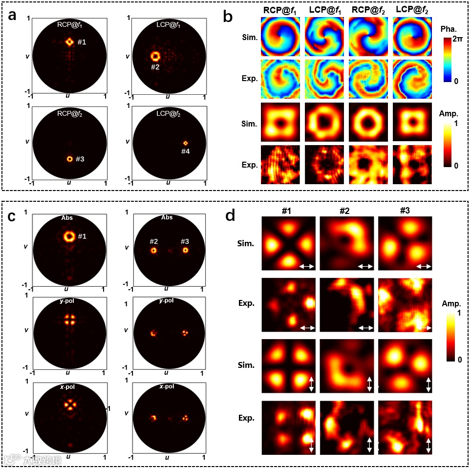 图2 两种示例的涡旋波束生成器件。双频自旋-轨道角动量转换器的 (a) 远场仿真分析结果,(b) 近场仿真分析与实验测试结果。双频离轴矢量涡旋光束生成器的 (c) 远场仿真分析结果,(d) 近场仿真分析与实验测试结果。