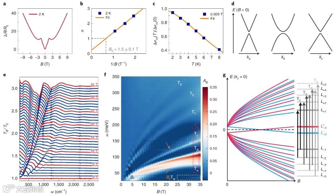 图2 | HfTe5的能带结构以及磁红外光谱