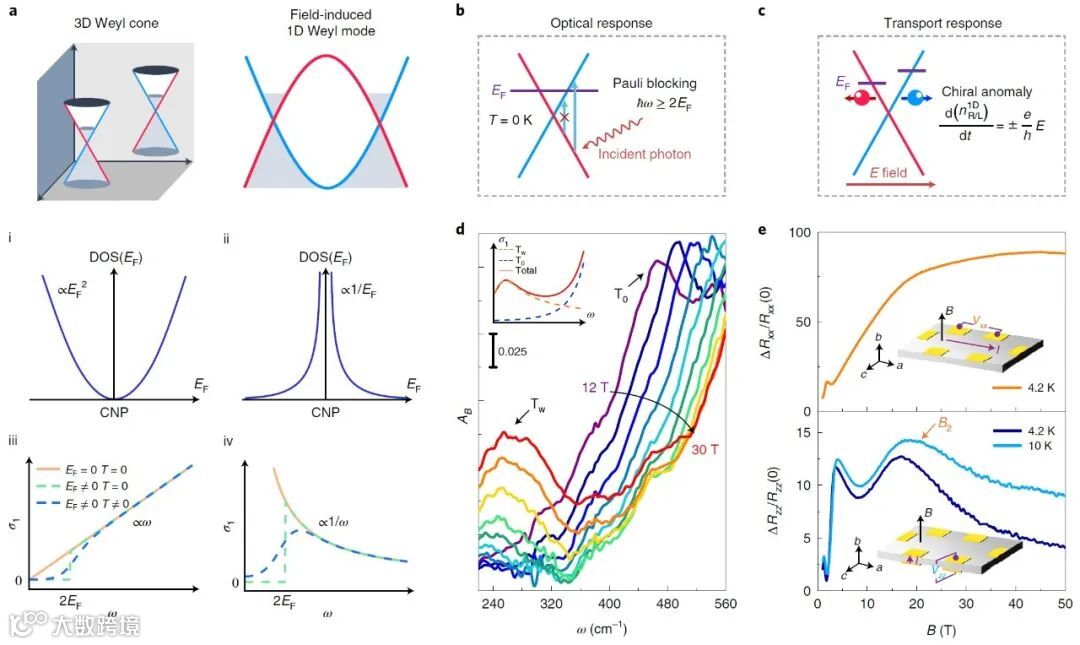 在强磁场远红外光谱上观察到泡利阻塞下一维线性能带的发散光电导,同时在脉冲强磁场输运测试中观察到一维外尔费米子手征异常导致的负磁阻现象。结合上述二者,证实了外尔费米子的一维特征和特殊的电磁响应。