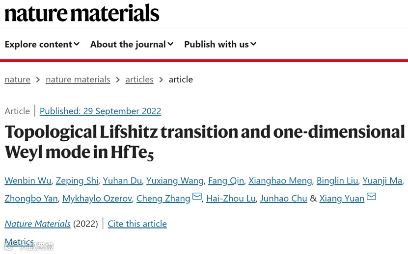 近日,华东师范大学的袁翔课题组与复旦大学的张成课题组开展了合作研究,在三维拓扑绝缘体HfTe5中发现了一维外尔费米子,其外尔锥由朗道能带构成。2022年9月29日,相关成果以“Topological Lifshitz transition and one-dimensional Weyl mode in HfTe5”为题在线发表在Nature Materials。论文以华东师范大学为第一单位,袁翔和张成是本文共同通讯作者,华东师范大学博士生吴闻彬和施泽平为共同第一作者。