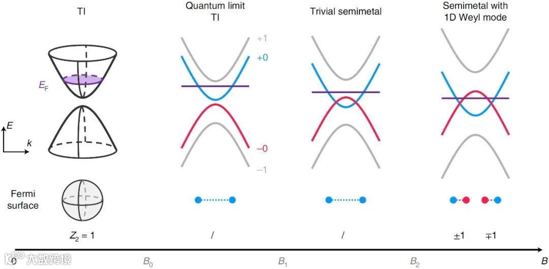 外磁场下,三维拓扑绝缘体中准连续的电子态会量子化为一系列分立的朗道能级,仅在平行磁场方向上仍保持色散。随着磁场的增大,费米能级向低指数穿过朗道能级并在B0穿过第一朗道能级进入量子极限。当磁场继续增大,自旋极化的第零朗道能级在临界磁场B1接触后,持续关闭能隙,并且形成准一维的交叉从而相变为平庸半金属。进一步施加更强磁场,朗道能级简并度的增加使费米能级持续向低能移动,并在临界磁场B2发生拓扑Lifshitz相变,费米面变成分立的两段并各自包裹相反手性的“外尔锥”。其色散结构和自旋构型与三维Bloch能带形成的外尔点非常类似,被称为一维外尔模。