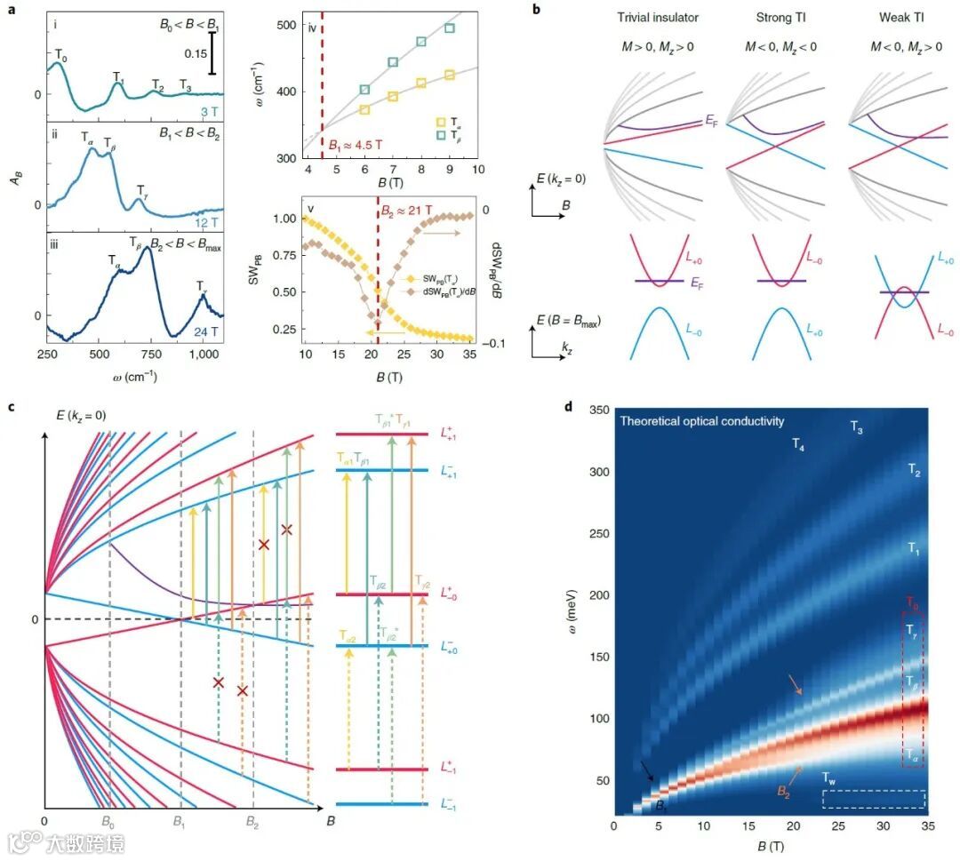 光学跃迁谱重随磁场的变化给出了实验上三个拓扑相变的临界磁场。同时,比较了进入量子极限后平庸绝缘体,强拓扑绝缘体,弱拓扑绝缘体费米能级随磁场的变化规律,指出弱拓扑绝缘体是实现一维外尔模的重要条件。结合实验参数通过理论模型预言了光谱行为。